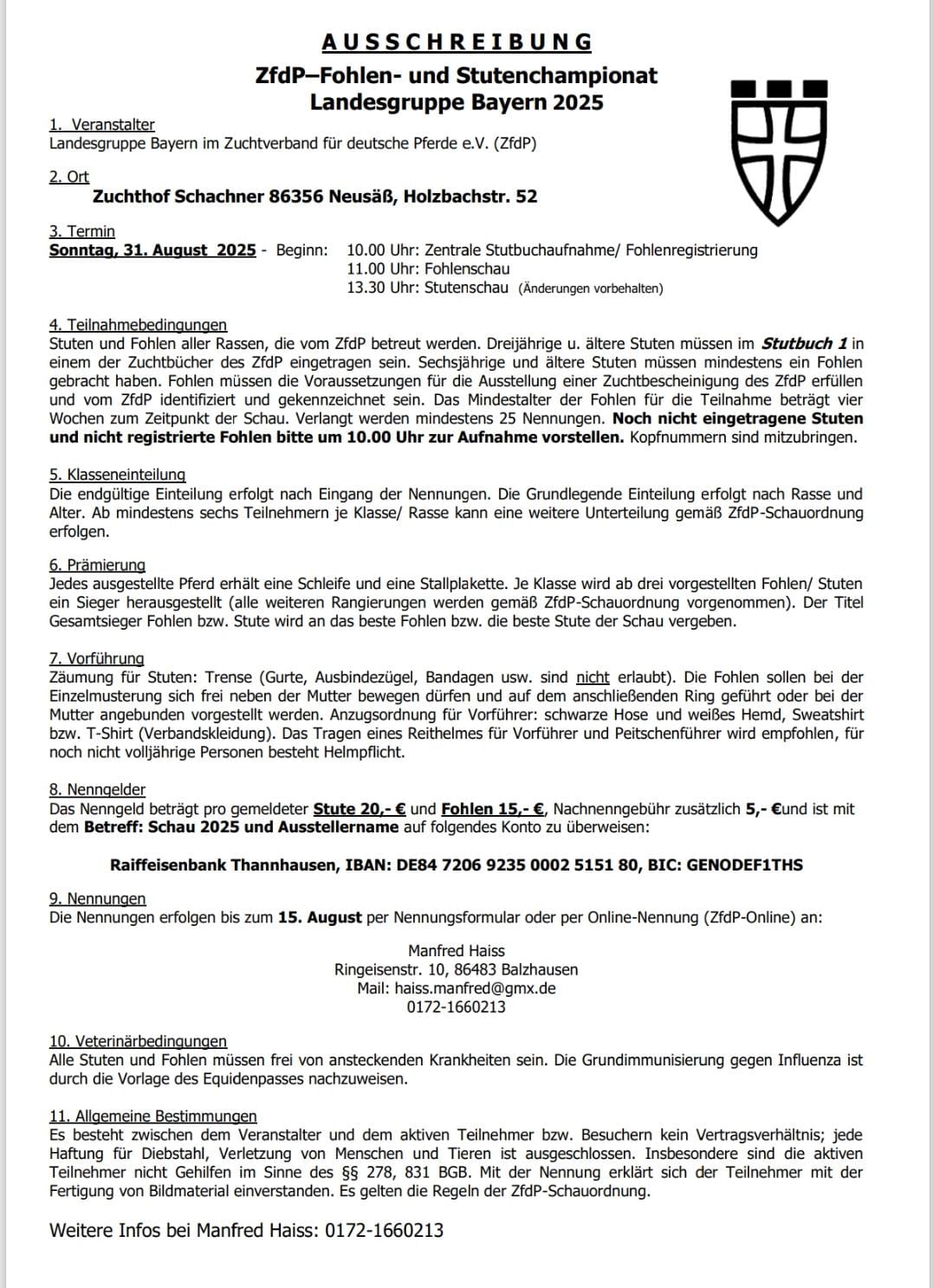 Am 31. August 2025 ab 10 Uhr laden wir Sie recht herzlich zum ZfdP- Fohlen- & Stutenchampionat Landesgruppe Bayern 2025 ein. Für Ihr leibliches wohl ist bestens gesorgt!
